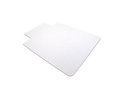 Description Reduce leg fatigue and protect carpets with this 53 x 45-inch Floortex Computex PVC chair mat. Roll through the day on this clear rectangular floor mat. PVC material delivers easy glide movement for reduced leg fatigue and also protects the carpet below without cracking or scuffing. This Floortex Computex PVC mat has a gripper for maximum stability and is resistant to water and fire. Carpet chair mat protects your flooring from ugly chair drags Made of PVC; 110 mils thickness Overall dimensions: 45"W x 53"L Lip dimensions: 25"W x 12"L Rectangular shape with lip and rounded corners Gripper back for standard pile carpets up to 0.38" thick Contains approximately 25% recycled material Produced using up to 30% renewable energy and 100% recyclable Free of lead, tin and cadmium Lifetime manufacturer limited warranty Computex Anti-Static Advantagemat PVC Clear Chairmat for Standard Pile carpets 3/8" or less , Rectangular with Front Lipped Area for Under Desk Protection(45" x 53") Specifications Material : PVC Thickness (mils) : 110 Warranty : Lifetime Limited Warranty Color Family : Clear Weight (lbs.) : 10.6 Series or Collection : Computex? Width in Inches : 45" Length in Inches : 53" Bottom Surface : Gripper Chair Mat Type : Standard Carpet Pile (Inches) : 0.375 Lip Length (Inches) : 12+ Lip Width (Inches) : 25 Chair Mat Floor Type : Carpet Chair Mat Shape : Rectangular w/Lip Chair Mat Size : 45" x 53'' Antistatic : Anti-static Edge : Straight Brand : Floortex Customizable : No Weight : 11.75 lbs. per Each