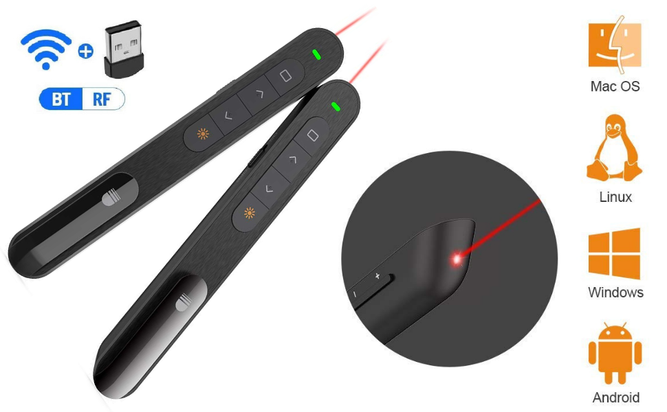 The Storin Wireless Presenter is a sleek, lightweight remote control designed for professional presentations. Featuring a robust 20-meter wireless range on a globally compatible 2.4G RF frequency, it offers precise red laser pointing and intuitive slide navigation. Its ergonomic metal and silicone build ensures comfort during extended use, while smart power-saving modes maximize battery life. Plug-and-play compatibility across major operating systems and a built-in USB receiver dock make it the ultimate tool for seamless, distraction-free presentations.