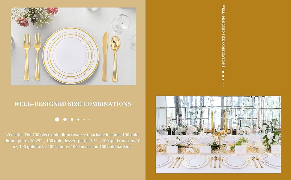 This 700-piece gold dinnerware set includes plates, cups, cutlery, and napkins for 100 guests, crafted from BPA-free, durable plastic with a polished gold finish. Designed for upscale parties, weddings, and large gatherings, it offers a stylish, convenient, and affordable alternative to traditional china rentals.