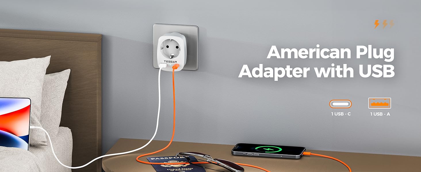 - Unique Design: 3 in 1 travel adapter. This USA socket adapter is used to connect devices with European (Type C) plugs and schuko (Type E/F) plugs to USA wall outlets. Max. power up to 1250W (Max. 125V, 10A). 2 USB ports can charge up to 2.4A. It is perfect for charging electrical products such as cellphone, tablet, etc