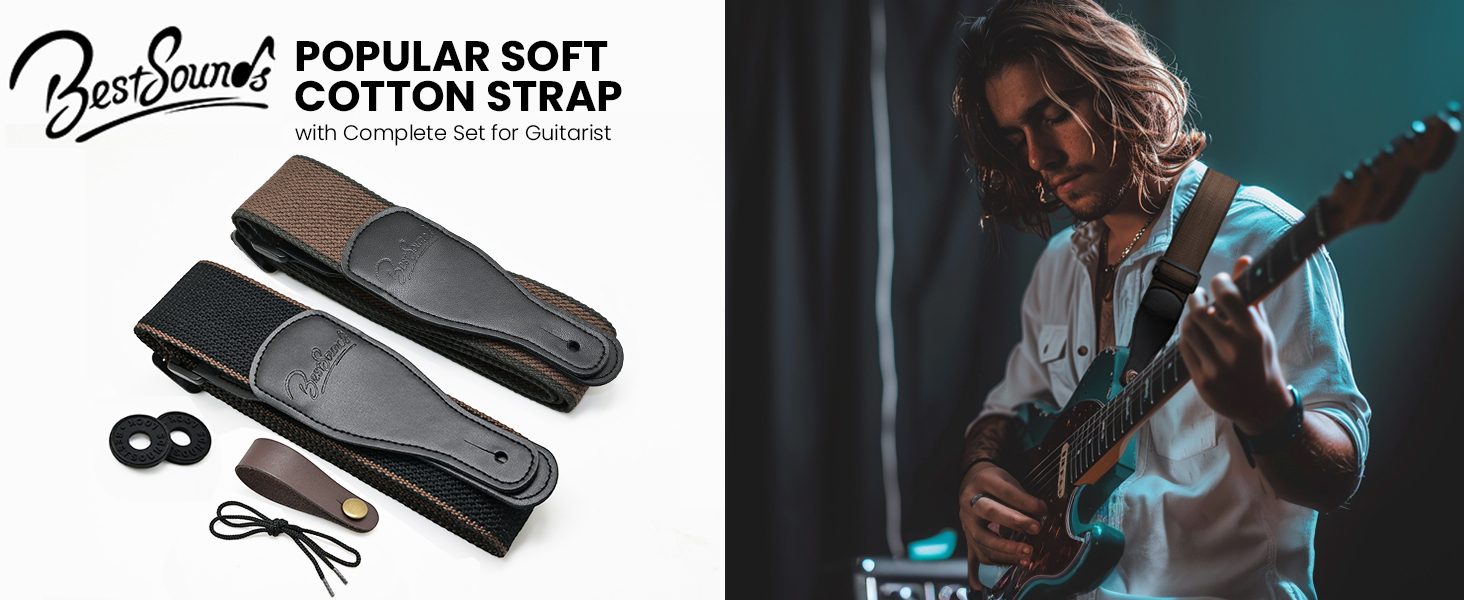 BestSounds Acoustic Guitar Strap, Soft Cotton & Leather Ends Strap for Electric & Bass Guitars come with 1 Button & 2 Locks