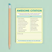The Knock Knock Awesome Citation Note Pad is a 4 x 5.25-inch pastel notepad featuring 50 matte sheets printed on FSC-certified paper with a durable chipboard backing. Designed to inspire and encourage, it’s the perfect office gift to boost morale and add a touch of clever creativity to everyday notes.