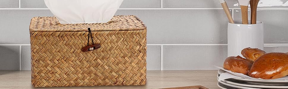 The Sumnacon Large Rectangle Tissue Box Cover combines natural seagrass weaving with a durable metal frame, designed to fit large 230T tissue boxes. Featuring an elastic buckle closure for easy one-handed access and secure fit, it enhances any space with farmhouse, coastal, or boho style while offering versatile use across home, office, and commercial settings.