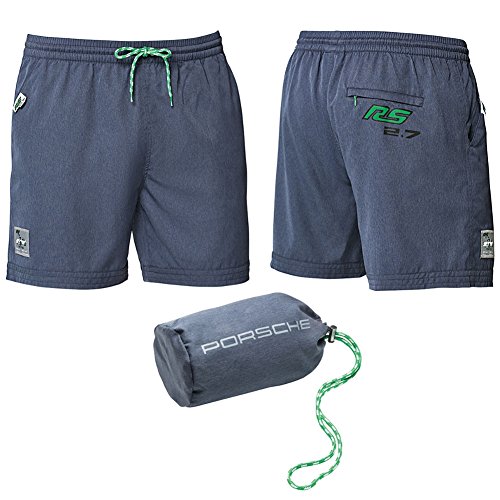Porsche blue melange swim trunks in the RS 2.7 style made of quick-drying material.Internal mesh lining.With side pockets, a zip pocket at the back Separate carrying pouch.Elasticated waist and draw cord in a viper green and white design.Made from 100% polyester.Genuine, original Porsche Selections clothing.