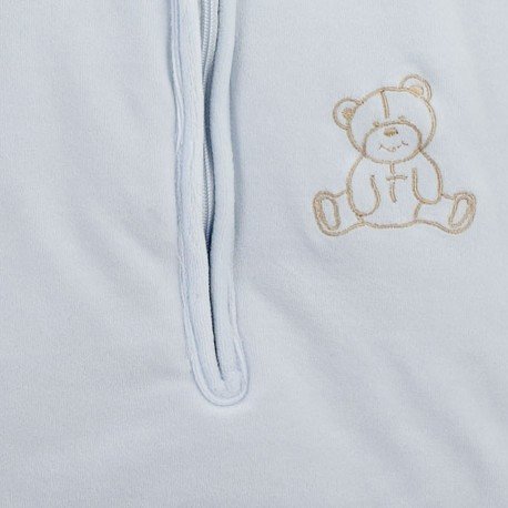 About this newborn sleeping bag: Sleeping bag 55cm made of soft sky blue velvet: 80% cotton/ 20% polyester Machine wash at 30°C Opening/closing by a front zip Embroidered "teddy bear" on the front Sky blue jersey lining: 100% cotton Filling: 100% polyester