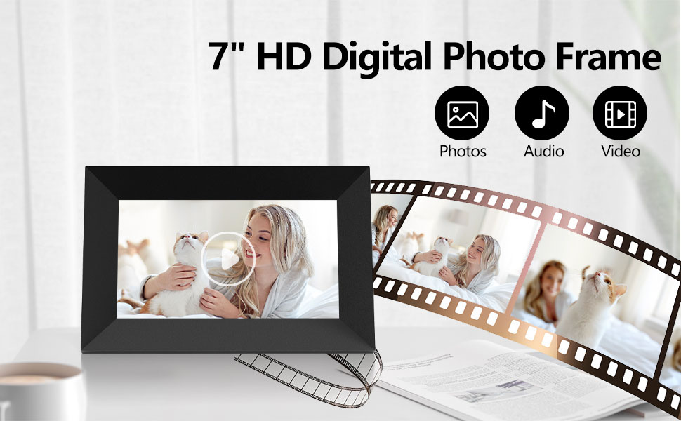 The Frameo 7 Inch WiFi Digital Photo Frame features a vibrant 1024x600 IPS touchscreen, 16GB internal storage with USB and MicroSD support, and smart auto-rotate functionality. It enables instant photo and video sharing worldwide via the Uhale app, making it a perfect gift for staying connected with family and friends.