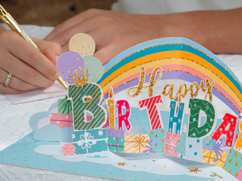 Cute pop-up Happy Birthday card with a rainbow and gift boxes. Card popped and stayed open as expected. Colors aren't quite as bright as shown, but still very colorful and pretty. A spot on the bottom for a personal note. Receiver seemed to really like the card.