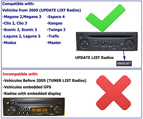 Auxiliary Cable and Radio Removal keys For Original Renault Update List Radio This KIT contains a cable which is compatible with all Renault vehicle equipped with an UPDATE LIST radio and it contains also extractors that permits to dismount the radio in order to install the cable. This Head unit adapter lead is used for connection of an iPod or MP3 Player to fit Renault's after 2005 using the UPDATE LIST radio. This will be shown just below the mode button on the front part of the radio. This lead will convert the CD port into 3.5mm Jack Compatible with the following: Clio - approx 2005 onwards with UPDATE LIST radio Espace - approx 2005 onwards with UPDATE LIST radio Kangoo - approx 2005 onwards with UPDATE LIST radio Laguna - approx 2005 onwards with UPDATE LIST radio Megane - approx 2005 onwards with UPDATE LIST radio Scenic - approx 2005 onwards with UPDATE LIST radio Trafic - approx 2005 onwards with UPDATE LIST radio Twingo - approx 2005 onwards with UPDATE LIST radio Incompatible with: Vehicules Before 2005 with TUNER LIST (old device) and CARMINAT radio Vehicules embedded GPS Radios with embedded display Setup: Press expert (next to a music note symbol) button to access AUX setup. Toggle on / off Package: AUX Cable Adapter x1 Stereo Removal Key x2