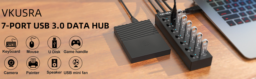 USB Hub, VKUSRA USB 3.0 Hub Splitter with 4ft Extended Long Cable, 7 Ports USB Expander Hub with LED Individual On/Off Switches for PC, Laptop, MacBook, Mac, PS4, HDD, Surface Pro and More