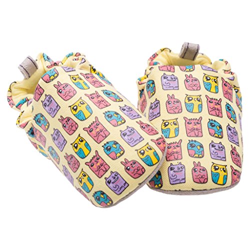 Animal Cubes Mini Shoes. Friendly creatures inspired by American Indian totem poles. Available in yellow cotton with a suede sole, suitable for walking (indoor use) and non walking babies. Non toxic inks, no exposed elastic.