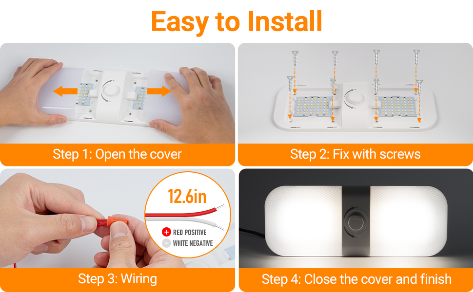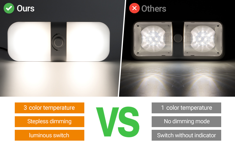 I recently upgraded my camper's lighting with these LED ceiling camper light replacements, and I couldn't be happier with the results. Here's why these lights are a fantastic addition to any camper:1. Versatile Lighting OptionsThe LED ceiling lights offer three distinct colors that can be easily changed with a simple press of a button. This feature allows for great flexibility in setting the perfect ambiance, whether you need bright white for cooking, a soft warm light for relaxation, or a cool blue for a calming atmosphere. All 3 colors are also dimmable for even more versatility.2. User-Friendly OperationTurning the lights on and off is straightforward. A short press of the button cycles through the different color options, while pressing and holding the button turns the light off. Twist the button to dim. This intuitive control makes it easy for anyone to use, even those who aren't tech-savvy.3. Stays Cool to the TouchOne of the standout features of these LED lights is that they stay cool to the touch. This not only enhances safety by reducing the risk of burns but also helps in keeping the camper's interior temperature comfortable, especially in warmer weather.4. Easy DIY InstallationThe installation process is remarkably simple, making this an excellent DIY update for any camper owner. The lights come with clear instructions, and the necessary hardware is included, allowing you to have them up and running in no time. You don't need special tools (just a screwdriver) or expertise to replace your old lights with these efficient LEDs.5. Energy Efficient and Long-LastingLED lights are known for their energy efficiency and long lifespan, and these are no exception. They provide bright illumination while consuming minimal power, which is particularly beneficial when you're off-grid and relying on battery power.Final ThoughtsOverall, these LED ceiling camper light replacements have exceeded my expectations. They offer versatility, safety, and ease of use, all packaged in a straightforward DIY installation process. Whether you're upgrading an old camper or outfitting a new one, these lights are a must-have for any camping enthusiast.Highly recommended for anyone looking to improve their camper's lighting!