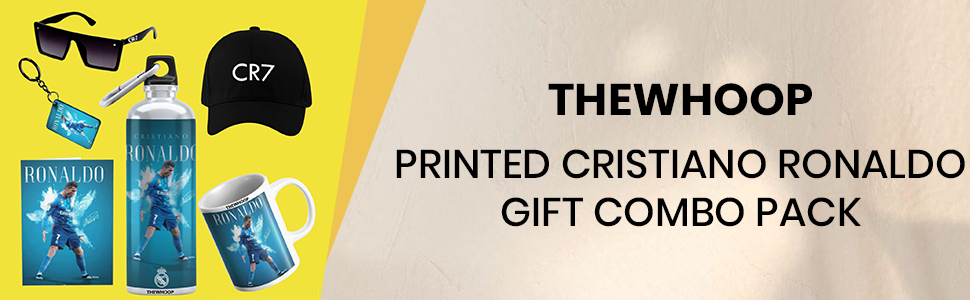 THEWHOOP Printed Cristiano Ronaldo Gift Combo is a premium 6-in-1 set featuring a 350ml ceramic mug, 750ml metal sipper bottle, stylish sunglasses, cap, keychain, and a greeting card—all adorned with high-quality CR7 prints. Designed for adult sports fans, this reusable and durable combo is perfect for gifting and daily use, crafted with care by The Whoop Mart in India.