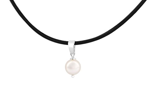 Luxurious thin black leather choker necklace with a small white pearl pendant, you wear the necklace close around your neck. There are two sizes small and medium. The pendant, clasp, extension chain and finishing are nickel free sterling silver. Length necklace: 34-37 cm. Pearl: 8 mm. Leather cord: 2 mm.
