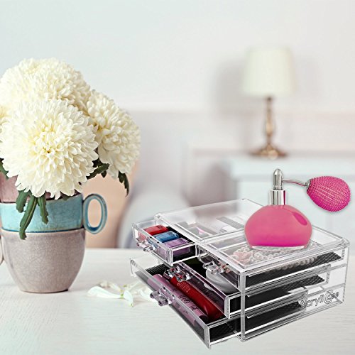 GREAT ORGANIZER FOR MAKEUP, JEWELRY & MORE: This 3 drawer organizer is great for organizing your cosmetic collection or jewelry collection, as well as your makeup applicators and brushes. This organizer is the magic solution you have have searching for 4 DRAWERS: This makeup organizer case features 4 drawers for you to separate and properly organize all of your belongings. For extra convenience, each of the drawers has a special soft black mesh padding, which is especially great for keeping your jewelry in place so that chains and the like do not get tangled.;EASY TO CLEAN: This organizer case was created with making your life easier in mind. Not only does it keep all of your belongings neat and tidy, but it is also very easy to clean. Simply dampen a cloth with a little soap and water, and wipe it down. Keep all of your makeup and jewelry clean and catalogued with the use of our premium organizer!;MAKES A GREAT GIFT: This organizer has so many uses that it makes a perfect gift for women, children, and men! It can be used for any task that needs tidying, and can be placed in a bedroom, bathroom, living room or kitchen! Tame all of the unkempt areas of your home with this organizer and restore order today!;100% SATISFACTION GUARANTEED: AcryliCase® guarantees that you will love our products. We strive to make only the best products from the best materials, at the most affordable prices for our customers! If for any reason you are not completely happy with our product, please contact a customer representative and let us make it right.