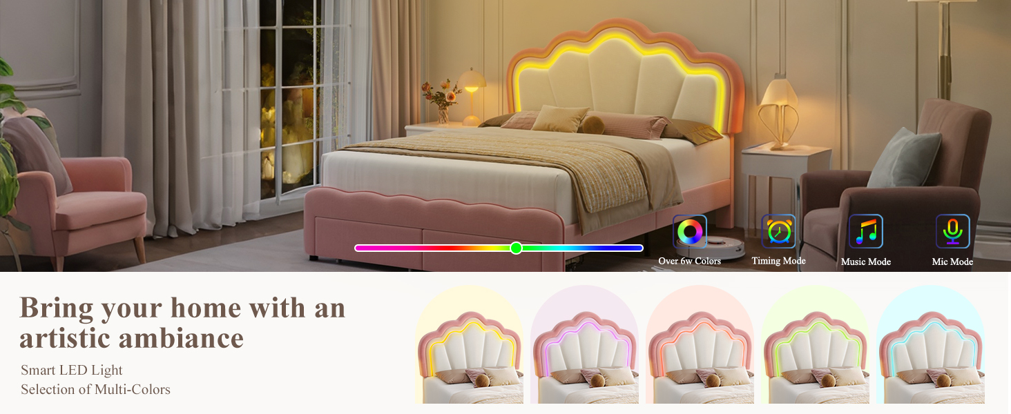 The HOSTACK Full Upholstered LED Bed Frame combines a chic pink and beige velvet lotus headboard with customizable LED lighting, sturdy metal and wooden slat construction supporting up to 800 lbs, and two spacious under-bed drawers for smart storage. Designed for easy assembly and no box spring needed, it’s the perfect blend of style, comfort, and functionality for the modern girl’s bedroom.