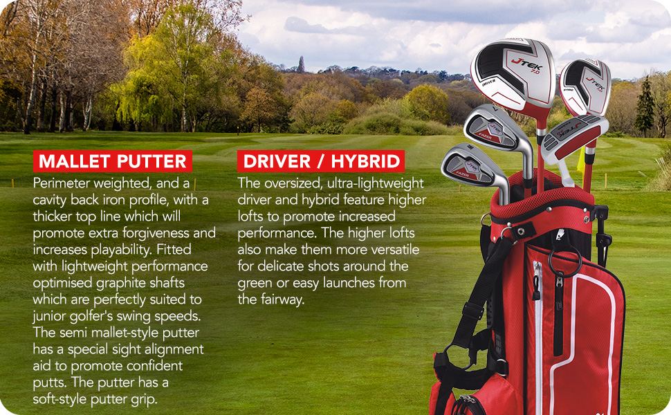 The Junior J TEK Kids Golf Package Set by FAZER features oversized, lightweight graphite shaft clubs optimized for ages 9-11. It includes a high-loft driver and hybrid for easy launches, forgiving perimeter weighted irons, and an alignment putter with sight aid. The set comes with a stylish, padded carry bag designed for convenience and protection, making it the perfect starter kit for young golfers aiming to improve their game with professional-grade equipment.