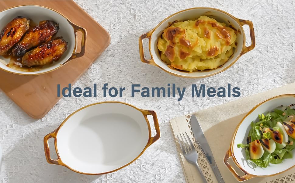 This set of four 20 oz ceramic oval baking dishes combines durable, high-temperature fired craftsmanship with elegant oven-to-table design. Featuring ergonomic handles for safe handling and stackable shapes for space-saving storage, these individual casserole dishes are perfect for single-serve gratins, pastas, and desserts.