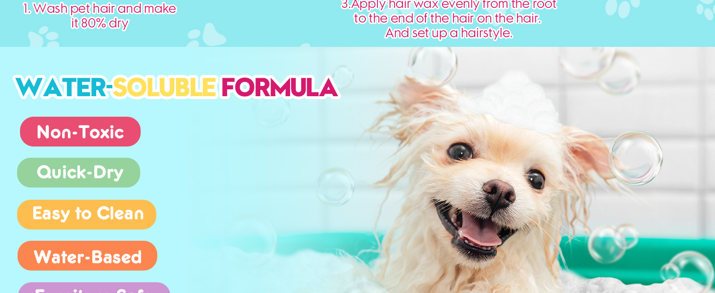- Pets with different fur colors have different display effects: Dog hair dye is suitable for White-haired type pets. For darker or brown hair, apply can be more challenging. Note that the wax may feel slightly sticky.