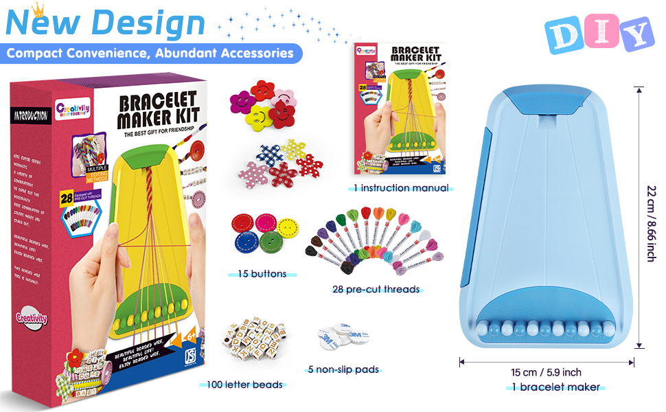 - Abundance of Accessories:The bracelet making kit includes 28 bundles of thread in 14 vibrant colors, along with letter beads, buttons and it provides 5 non-slip pads that can be securely attached to the table. Furthermore, it comes with a step-by-step instruction guide featuring a clear combination of pictures and text to help you get started quickly. It's easy to take with you on road trips or when traveling by car or airplane
