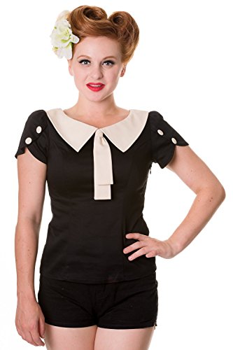 The Tie Collar Shirt is a black blouse by Banned Apparel, with a sexy retro vibe! This rockabilly top has a collar with tie to create a cute bow, buttons on the shoulders and fastens with a side zip for a fitted look.
