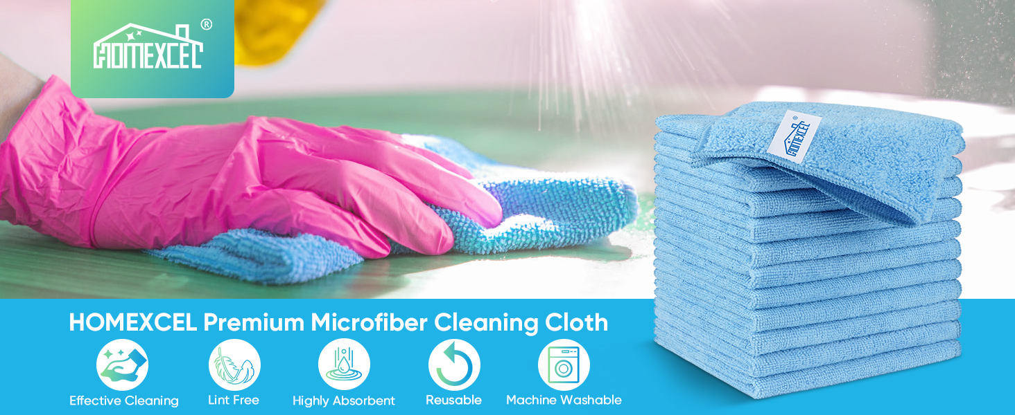 The HOMEXCEL Microfiber Cleaning Cloth 12 Pack features premium, lint-free microfiber towels sized 11.5"x11.5" designed for superior water and oil absorption. Scratch-free and highly durable, these reusable cloths excel in cleaning cars, kitchens, and household surfaces while reducing waste with their machine washable construction.