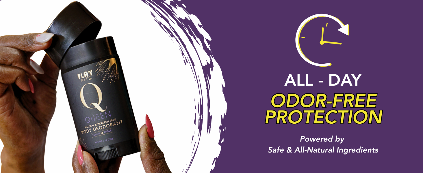 PLAY PITS Queen Scent Natural Deodorant is a 2-pack of 2.65 oz non-toxic, paraben-free deodorants infused with essential oils. Designed for sensitive skin and the entire family, it combines a luxurious Lemon, Amber, and Jasmine fragrance with effective moisture and odor control to keep you fresh and confident all day.