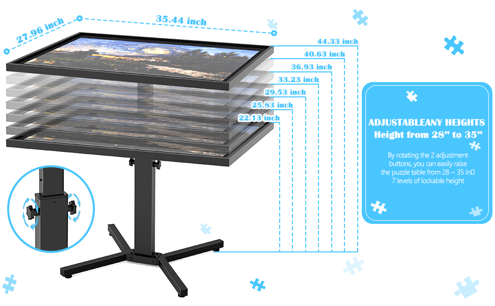 This 1500-piece jigsaw puzzle table features a sturdy metal frame and thick wooden board with felt covering to prevent piece slippage. It offers 7 adjustable height levels (28-35 inches) and 5 tilt angles up to 40°, ensuring ergonomic comfort. Equipped with 4 color-coded sorting trays and a semi-transparent cover, it protects and organizes your puzzle. Multifunctional for use as a desk or coffee table, it’s a perfect gift for puzzle enthusiasts seeking style and functionality.