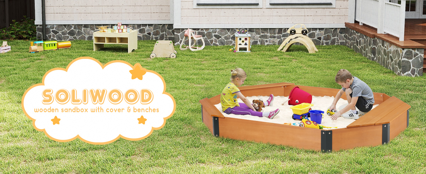 This 75.5''x53''x8.5'' octagon sandbox features a spacious design for multiple kids, crafted from FSC-certified 0.7'' thick wood reinforced with angle iron posts to hold up to 700 lbs of sand. It includes a rain-proof nylon cover and fabric liner, offers quick and easy assembly, and comes with 24/7 customer support for hassle-free setup and maintenance.