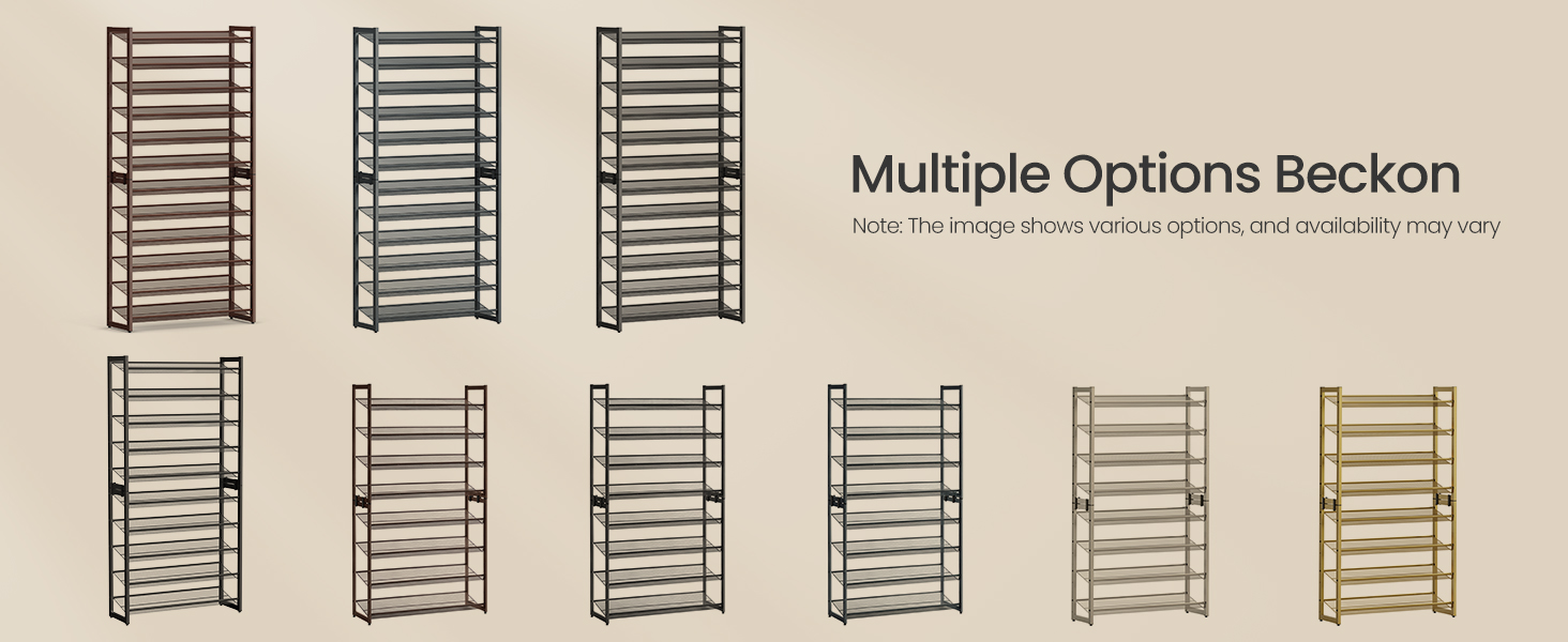 The SONGMICS 10-tier metal shoe rack offers a versatile, sturdy solution for organizing up to 50 pairs of shoes. With adjustable flat or angled shelves, stackable design, and a robust 22 lb per shelf capacity, it adapts to your space and shoe collection while ensuring stability and easy assembly.