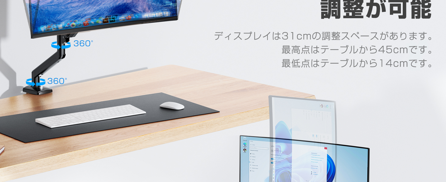 27インチのモニター用に購入しました。アルミニウム製でしっかりとした作りになっており、ぐらつきもありません。ガススプリング式なので、上下の動きもスムーズで、位置の調整が簡単です。VESA対応で取り付けも問題なく、ケーブル収納機能も地味に便利でした。クランプ式とグロメット式の両方に対応しているのもありがたいポイントです。見た目もスッキリしていて、デスク周りがとても快適になりました。