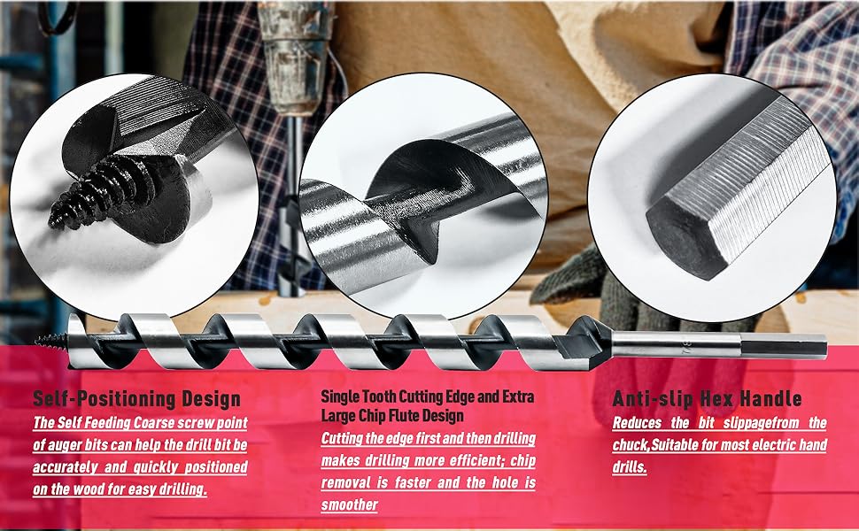 NICAVKIT 6Pcs 12-Inch Long Auger Drill Bit Set for Wood, 1/4"-7/8" Inch Hex Shank Ship Auger Drill Bit for Soft and Hard Wood, Plastic, Drywall and Composite Materials